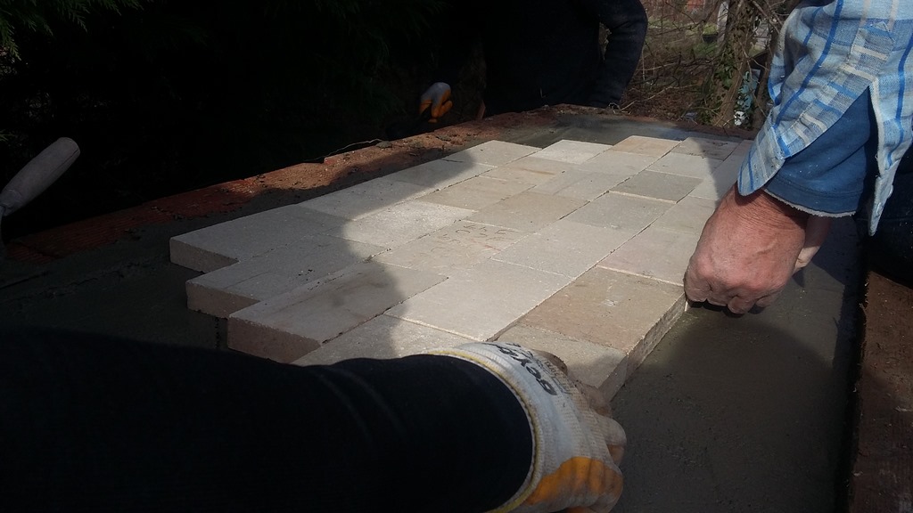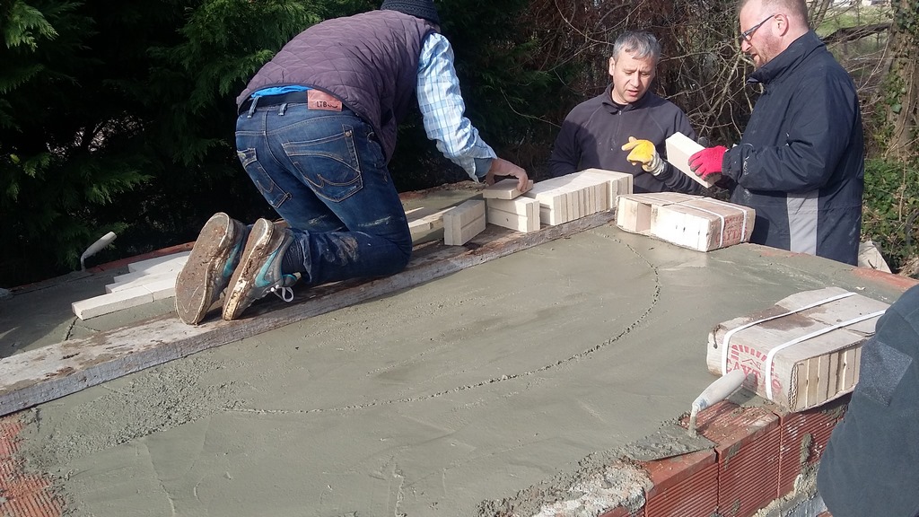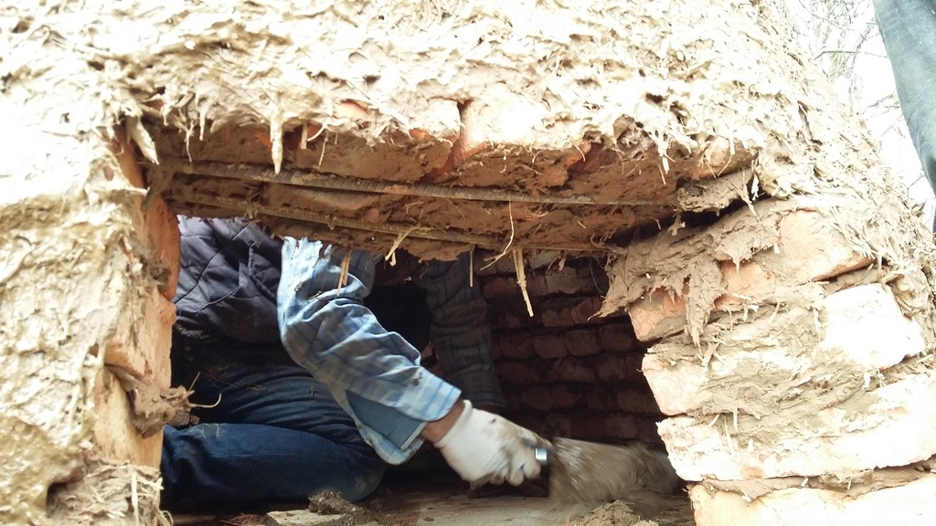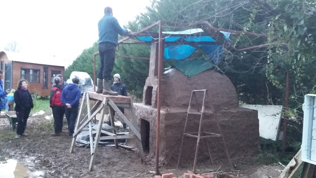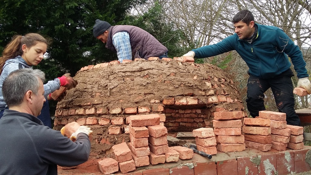 Sonra sıra ateş tuğlalarıyla fırının pişirme zeminini döşemeye geldi. Bu iş için çimento karıldı ve fırının zemini çimento ile kaplandı. Çimento yüzeyin üstüne özenle ateş tuğlaları döşendi. Bu esnada bir diğer ekip bağlayıcı harç olarak kullanılacak kerpici hazırlıyordu. Toprak, saman ve su birbirine karılıyor ve uzun uzun karıştırılıp ayaklarla çiğnenerek eziliyordu. Permakamp çocukları da bizlere toprak kazma ve el arabasına yükleme işlerinde bir hayli yardımcı oldular J. Kerpiç hazır olduğunda fırının zemini de ateş tuğlalarıyla döşenmişti. Yine çocuklarla birlikte, elden ele vererek tuğlalar arabadan indirildi, ve sıra fırının duvarlarını oluşturacak tuğlaların örülmesine geldi. Bu iş çok hassas bir işti, zira tüm tuğlaların merkeze doğru bakmaları ve merkeze eşit mesafede olmaları gerekiyordu. Ramazan Usta ateş tuğlalarını dizmeden önce, daire şeklindeki fırın zemininin merkezine, yaklaşık bir metre boyunda bir ip yerleştirdi; ipin ucuna uzun bir çivi bağladı ve böylelikle tuğlalar dizildiğinde ip sabitlenmiş oldu. İpin işleme mantığı şöyleydi; çivi işaret parmak ve orta parmak arasında yere paralel yatay olarak tutulup, ip en gergin noktasına kadar gerilir ve çivinin paralel yüzeyi ile tuğlanın paralel yüzeyi aynı açıda tutulur. Tuğla mutlaka ipe bağlı olan çiviye değmelidir. Böylece tüm tuğlalar hem merkeze bakar hem de merkeze eşit uzaklıkta yerleştirilmiş olur. Basit ama muazzam bir teknik! Biz harıl harıl çalışırken, mutfak ekibimizin “Yemek hazır!” diye seslendiğini duyduk. Mutfak ekibi harika yemekler hazırlamıştı: Kuzinede pişmiş pazılı börek, soba ateşinde pişmiş mercimek yemeği ve sebze çorbası. Bir muhabbet yedik yemeklerimizi. Çayların ardından çok uzatmadan çalışmaya döndük. Ancak dolu mide ile çalışmak daha zormuş meğer J.  Bir hız tuğlalar örüldü, tekrar tekrar kerpiç harç hazırlandı. Fırın hızla yükseldi. Fırının çatısını taşıması için ahşap bir iskele kuruldu. Ahşap iskelenin üzerine kalın kartonlar yerleştirildi ve üzeri yuvarlak formda olacak şekilde kerpiçle sıvandı. İçerde kalan ahşap iskele, fırın yandığında yanmak üzere tasarlanmıştı. Fırını 10 kişilik ekibimizle bir günde bitirdik. Ertesi gün yağmur yağacağı için üzerini kapama telaşına düştük.  Ayrıca fırının üzerine bir çardak yapmak niyetimiz de vardı uzun vadede, fırını yağmurdan korumak için. Arazide atıl duran demir bir konstrüksiyonu fark etti Ramazan usta, “Hemen bunu taşıyıverelim” dedi. Aslında bu konstrüksiyonu, uzun zamandır yapmayı planladığımız marangozhanemiz için saklamıştık, ama fırın için kullanmaya karar verdik hızlıca. Fırının üzerine taşıdık demir konstrüksiyonu ve üzerini elimizdeki brandalarla kapattık olabildiğince. İşleri bitirince de oturup ağız tadıyla çay içip bir şeyler atıştırdık... Çok çalışıp fırını bitirmiştik ve artık vedalaşma zamanı gelmişti J.