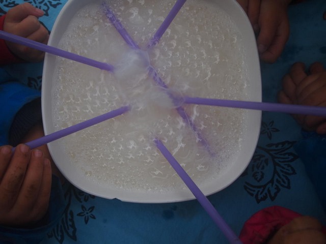 Nesrin’le kurabiye yapacaklar mutfağa gidiyor ve diğerleri benim yanıma Dom’a geliyorlar. Biz de önce arap sabunu dolu kaseye pipetleri daldırıp suyu nefesimizle köpürtüyoruz, sonra da ortaya yerleştirdiğimiz küçük topları pipetimizden üflediğimiz hava ile hareket ettiriyoruz. Yine bir ekip çalışması söz konusu, çünkü topların yere düşmemesini hedefliyoruz. Bu yüzden büyük bir uğraş var. Hem nefesimiz hem dikkatimiz aktif. Rüzgar oyunlarından sonra kısacık dışarı çıkıyoruz, bulutlara bakmaya. İlk önce bulutları pek seçemiyoruz, sonra bir gölge gibi hareket ettiklerini farkediyoruz.