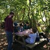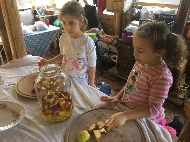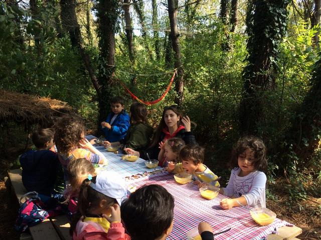 Saat 12:00 yemek zamanı. Orman ekibi kampa dönüyor ve hep birlikte yemeğe oturuyoruz. Yemek sonrasında üç kovaya ayrılıyor atıklarımız. Ardından öğretmenlerinin yardımı ve Tolga’nın desteği ile çocuklar bulaşıklarını yıkıyorlar. Saat 13:00’a kadar serbest zaman. Çocukların diledikleri gibi oynama zamanı. 13:15’te 1. Sınıf orman yürüyüşüne çıkıyor, Hazırlık Sınıfı ise Permakamp’ta kalıyor. Biz sakince ilerliyoruz ormanda. Böcekler, mantarlar ve yaprakların altında saklı mis kokulu toprak. Ormanla ilk karşılaşma. Mantarlara neden dokunamayız? Böcekleri neden dilediğimiz gibi elimize alamayız? Büyük bir bütünün sadece bir parçası olduğumuzu ve diğer canlıların var olma haklarına saygı göstermek üzerine sohbetler eşliğinde ormanda yürüyoruz. Geride kalan ekip bizim ardımızdan kubbe-dom yapıya giriyor öğretmenleri ile birlikte. Su elementi, tohum, kompost üzerine kitaplar karıştırıyorlar. Sınıf çalışmasının ardından onlar da ekiplere ayrılıyorlar. Mutfak ekibi ve oyun alanı yapılandırma ekibi. Mutfak ekibi elma sirkesi kurup yoğurt mayalıyor bu defa. Bakteriler üzerine çalışmaya devam yani. Bu sene turşu kurmadan önce sirke yaparak giriş yapıyoruz fermantasyona. Turşunun bir adım öncesi yani. Bahçedekiler oyun alanına tencere ve tavalarla bir müzik panosu kurma çalışması yapıyorlar. Çiviler çakılıyor, tencereler, tavalar, teneke kutular takırdıyor...
